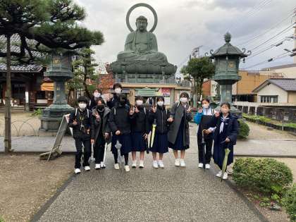 2年 校外学習 その21 公開日 2021/11/12 更新日 2021/11/12 2年生 11月12日(金) 高岡大仏にも立ち寄りました。生徒は事前学習で15mを超える高さであることを知っていましたが、実際に見て、その大きさに驚いているようでした。