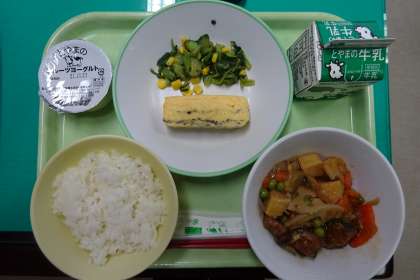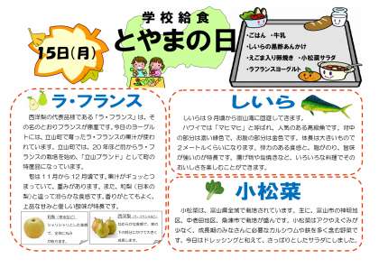 ヨーグルトには「フルーツヨーグルト」とかいてあったことに気がつきましたか?このヨーグルトに「ラ・フランス」の果汁が混じっていました。そして、一見酢豚のようにみえるおかずは、豚ではなく「しいら」です。そしてサラダには富山県産の「小松菜」が使用されていました。「えごま」も富山県産です。「ラ・フランス」が富山で栽培されているのですね。おいしくいただけましたか?