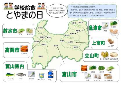 11月は富山県食育推進月間です。この期間、富山で育った米や肉、野菜や果物を多く使った献立を取り入れた『学校給食とやまの日』を実施します。今日は、その食材を使った給食の日でした。