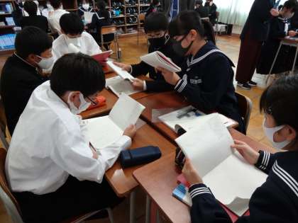 1B 国語 公開日 2021/11/16 更新日 2021/11/16 1年生 11月16日(火) B組もA組と同様に、「幻の魚は生きていた」という説明文を教材として「ジグゾー学習を通して内容を確認しよう」という課題に取り組みました。 自分の考えをもった上で他の人が書いた文章を読み、「この情報は必要か」「この部分に使う言葉はこれでよいか」等、文章をよりよくするために意見を交わしていました。