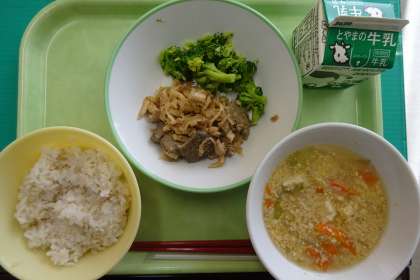 今日の「スタミナレバー煮」の豚レバーに多く含まれているビタミンAは、目の機能、皮膚や粘膜の健康を保つために必要なビタミンだそうです。 粘膜のダメージを回復する効果や免疫力を高める効果があるそうです。ですから、疲労回復、貧血予防、アレルギー予防など様々な効能が期待できるそうです。臭いが苦手という人もいるかもしれませんが、栄養士さんが中学生の体のために考えた献立です。何でも残さず食べましょう。
