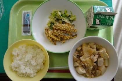 「里芋と厚揚げのうま煮」には、里芋も厚揚げもたくさん入っていて食べ応えがありました。「きびなご」と言うと、鹿児島県が産地として有名です。見た目は小さめの「さより」に似ています。鹿児島では、刺身としてよく食されています。富山県で言えば、ほたるいかや白えびのように、きっと、獲れたての新鮮な「きびなご」が手に入りやすいからでしょうね。