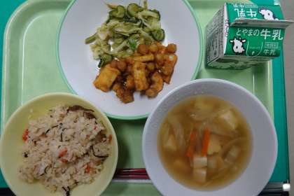 今日の給食 公開日 2021/11/24 更新日 2021/11/24 学校生活 11月24日(水) 「いかと豆のカレー揚げ」は、カレー風味を感じながら、おいしくいただきました。カレー味は、きっと小中校生の好きな味ではないでしょうか? 【今日の献立】 ・ひじきごはん ・牛乳 ・いかと豆のカレー揚げ ・グリーンサラダ ・豆腐スープ