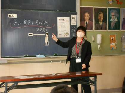上条小学校 乗り入れ授業 その4 公開日 2021/11/29 更新日 2021/11/29 その他 11月29日(月) カモメや子犬の鳴き声を例にして発声練習をすると、素直にまねをして発声するなど熱心に取り組みました。校歌の歌詞にいても「銀嶺」ってどういう意味ですかと質問するなど意欲的に学習しました。