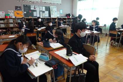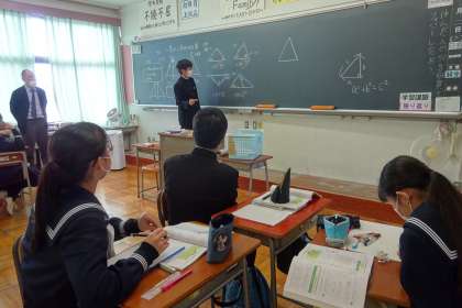 2B 数学 公開日 2021/12/02 更新日 2021/12/02 2年生 12月2日(木) 二等辺三角形の性質を使って角度を求める問題を練習しました。自分が求めた方法を、黒板に式をかいて、うまく説明できました。
