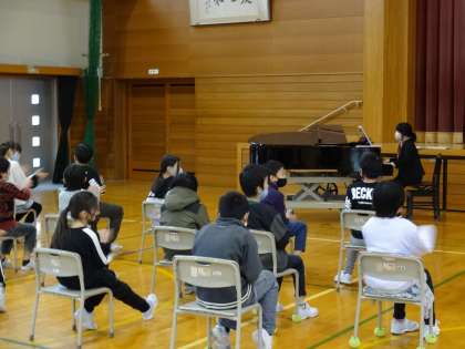 3、4年生は、初めに「チャレンジ!」という曲を元気よく歌ってくれました。(写真上段)