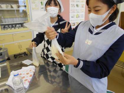 2A 家庭 その1 公開日 2021/12/07 更新日 2021/12/07 2年生 12月7日(火) 今日の課題は「災害時を想定して、ポリ袋調理をしよう」でした。 1つのポリ袋の中にはお米と水、もう1つのポリ袋の中にはホットケーキミックス粉と牛乳を入れて、湯せんで調理します。