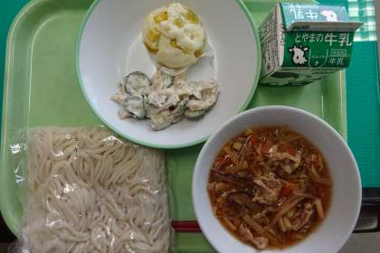 今日の給食 公開日 2021/12/09 更新日 2021/12/09 学校生活 12月9日(木) ソフト麺は人気メニューです。五目あんかけと言うくらいですから、いろいろな具材が入っておいしかったです。3年生は今日2個目の蒸しパンです。 【今日の献立】 ・ソフト麺の五目あんかけ ・牛乳 ・蒸しパン ・れんこんサラダ