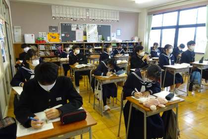メロスについて、家族、知人・友人の2つの視点で班ごとに考え、ボードに記入しまとめました。先生のたとえ話に、笑いが起きて楽しそうに授業に参加していました。
