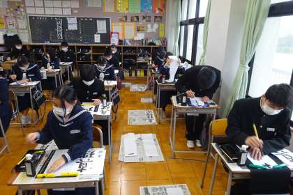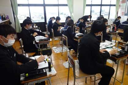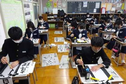 3年A組の様子です。立って書いている人もいます。本当は、体育館など広々とした場所で、床で書き初めをするとよいのですが、この季節はかなり寒いので暖房が効く教室で行っています。