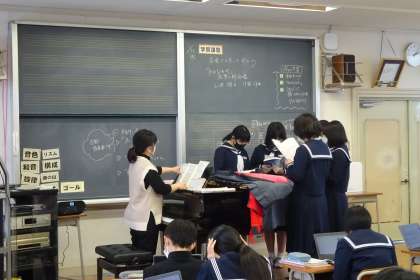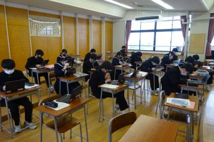合唱曲「大切なもの」のパート練習をしました。待っている間に、自分が好きな曲紹介プリントを、タブレットで調べて作成しました。