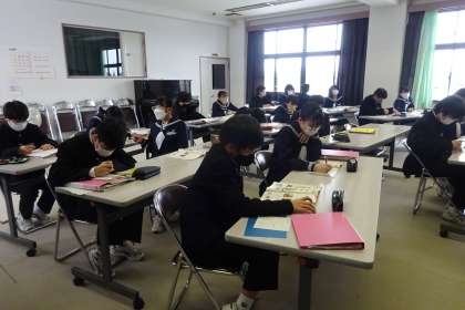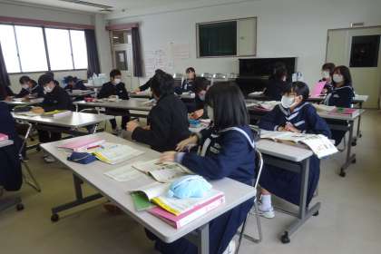 1A 英語 公開日 2022/01/17 更新日 2022/01/17 1年生 1月17日(月) 動詞を過去形にするときに付ける「ed」について学習しました。付ける単語によって同じ「ed」でも音が異なります。座席の隣や前後の人とペアを変えてペア学習を進めていました。