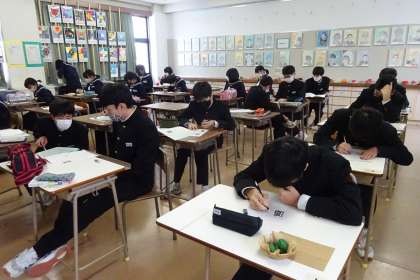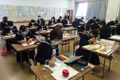 1B 美術 公開日 2022/01/17 更新日 2022/01/17 1年生 1月17日(月) 紙粘土を使って作った野菜や果物が完成し、コメントを書きました。また、コメントを書き終わった人は、次の学習の準備のためのプリントを記入していました。