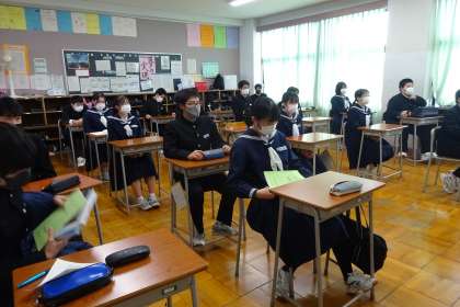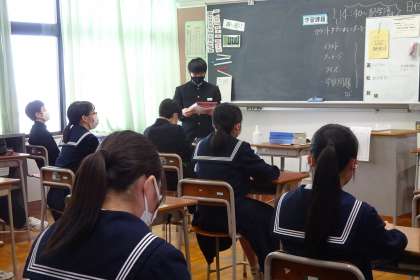 B組では、日直が司会進行をし、お知らせも伝えていました。お知らせ冒頭に「中学校生活も残り少なくなってきましたが〜」という言葉がありました。卒業式まで残り2か月を切り、学校にきて顔を会わせる日数を考えるとさらに短い期間になります。残りの中学校生活を仲間と仲よく過ごし、充実した日になりますように・・