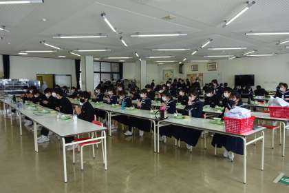 久しぶりにランチルームをのぞいてみました。本校では、2年前までは全校生徒がランチルームで、一つのテーブルに6人が向かい合って、会話を楽しみながら給食を食べていました。しかし、新型コロナウィルス感染防止のため昨年度は、1年生がランチルームで、2・3年生は各教室に分散して食べました。