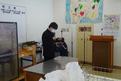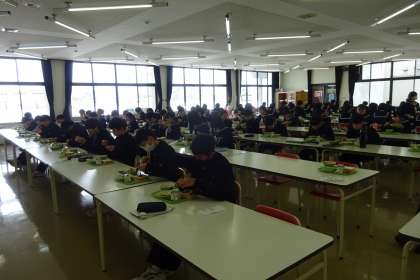 そして令和3年度は、一つのテーブルに2人ずつ、1・2年生は背中合わせになってランチルームで、3年生は各教室で黙食しています。写真はその様子です。