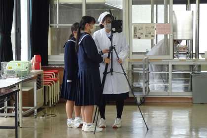 写真上は、新入生説明会で学校生活を伝えるために、生徒会執行部が、給食時間の様子を試し撮りをしているところです。