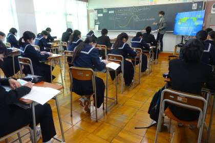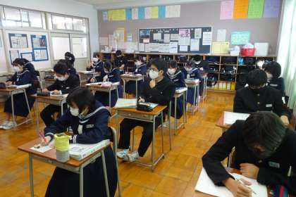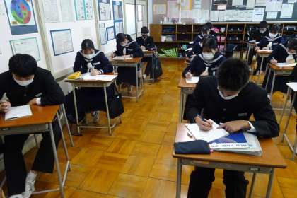 3B 英語 公開日 2022/01/24 更新日 2022/01/24 3年生 1月24日(月) 課題は「もし世界が100人の村だったら(Beyond Borders)」で、unit.6の学習のまとめをしました。 unit.6では、国をこえて助け合う大切さを知り、自分に何ができるか考えることがテーマになっています。前時に、ガーナのカカオ農園で働きつづける兄弟のビデオ映像を視聴し、この単元でそれぞれが考えたことをまとめました。