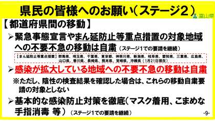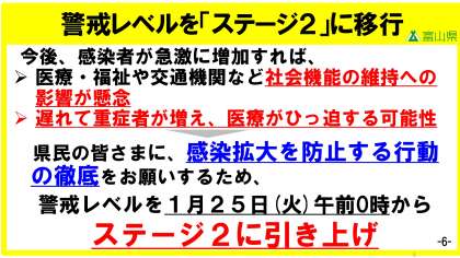 今日から富山県は新型コロナウィルス感染症の警戒レベルが「ステージ2」となります。先週末から新規感染者数が100名を超える日があり、全国でも感染は拡大し「まん延防止重点措置」を実施する都道府県が半数以上になりました。