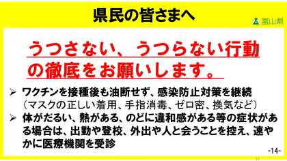 下記のとおり(富山県のホームページから抜粋)今できることは、基本的な感染対策です。生徒の皆さんは、マスクの正しい着用、こまめな手洗い・手指の消毒等(校内に衝動液が設置されています)基本的な感染対策を行い、感染防止に努めましょう。また、登校前に検温を行い体調管理に努めましょう。