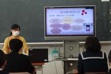 今日は、本校のスクールカウンセラーの先生に1年A組で「心の健康」について授業をしていただきました。
