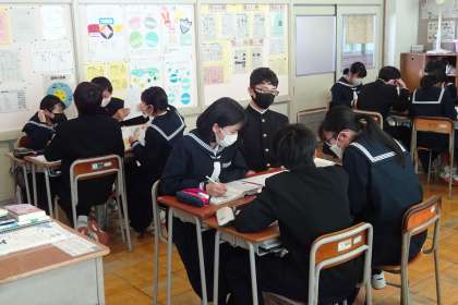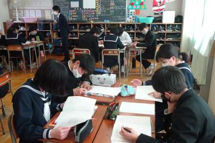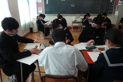 1B 国語 公開日 2022/02/08 更新日 2022/02/08 1年生 2月8日(火) 自分たちで作成した学年末考査の予想問題に取り組みました。 問題をつくることで、その単元で何が重要な内容かを考えることで学習のまとめにもなるとてもよい取組です。そして、実際にその問題に取り組み、勉強にもなります。班ごとに問題を見ながら、話し合う姿がみられました。