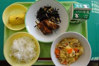 高野豆腐の卵とじは、鶏肉も入っておりボリュームがあって、食べ応えがありました。魚も大きなあじで身が厚く、今日はお腹いっぱいになったのではないでしょうか。