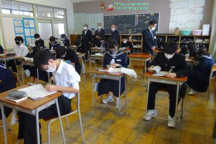 写真は1年A組の様子です。期末考査に向けて、ワークやプリントに取り組んでいました。