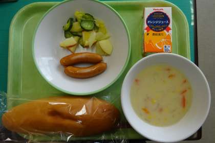 今日の給食 公開日 2022/02/14 更新日 2022/02/14 学校生活 2月14日(月) 今日は久しぶりの「米粉コッペパン」でした。いつものコッペパンに比べると、ほんのりと甘味を感じました。 【今日の献立】 ・米粉コッペパン ・オレンジシュース ・ウインナー ・白菜とりんごのサラダ ・コーンチャウダー