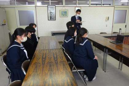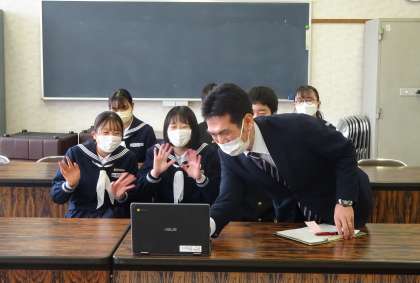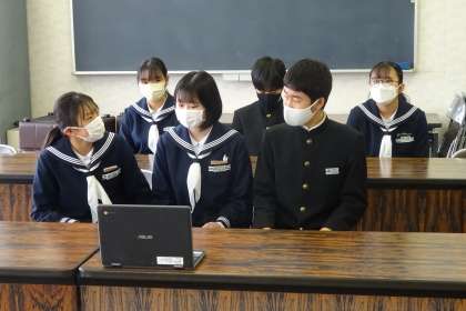 お昼休みの時間を利用して、三郷小学校児童会(5年生)と三成中学校生徒会生徒(2年生)がリモート会議を行いました。