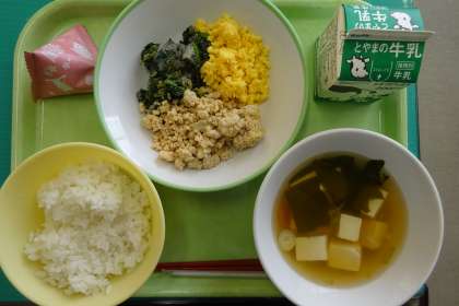 今日は、ひなあられ、すまし汁等、おひな祭りにちなんだ給食でした。ごはんはちらし寿司が定番ですが、そぼろ丼でしたが炒り卵の黄色が鮮やかで見た目も華やかでした。