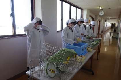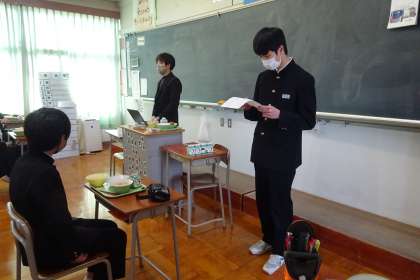 3年生 給食 その1 公開日 2022/03/04 更新日 2022/03/04 3年生 3月4日(金) 卒業お祝い給食ということで、3年生の給食時間をのぞいてみました。廊下で配膳をし、食べ始める前に給食を紹介していました。 (写真上:3A配膳) (写真中:3B配膳) (写真下:3A給食紹介)