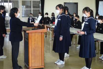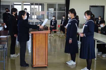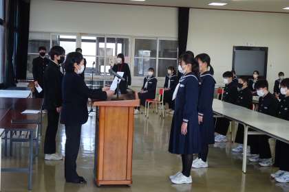 3月11日(金) そして、生徒会長、生徒会副会長3人に、任命書が校長先生から授与されました。
