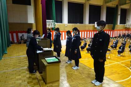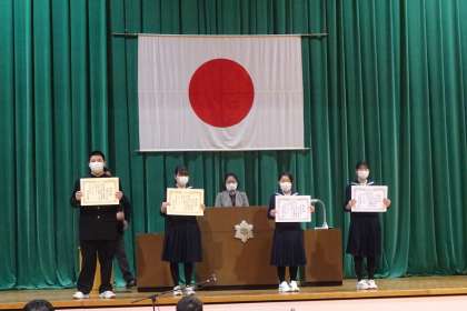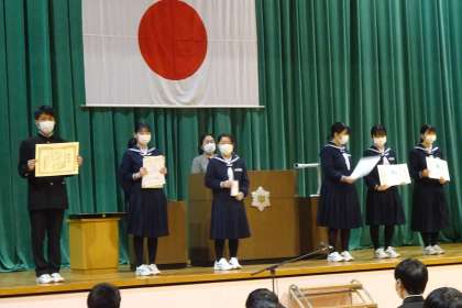 受賞伝達式 公開日 2022/03/14 更新日 2022/03/14 学校行事 3月14日(月) 明日卒業式を迎える3年生の受賞伝達式が行われました。 先に、校内書き初め大会、富山市書写展覧会、富山県小・中・高校生書き初め大会、富山県造形教育作品展出品、富山県中学校美術展出品、富山県をよくする会の受賞報告、伝達式を行いました。(写真上・中) また、3年生の修了式後に富山県中学校体育連盟表彰、富山県中学校文化連盟表彰の伝達式を行いました。(写真下)