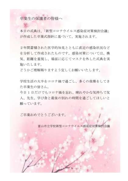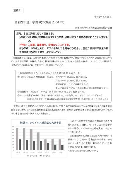 「富山市立学校新型コロナウィルス感染症対策検討会議」で作成された卒業式指針についてお知らせします。
