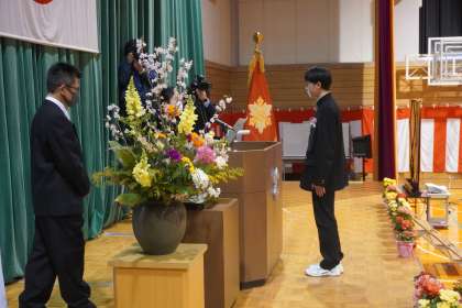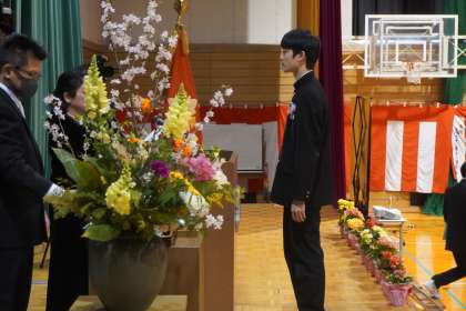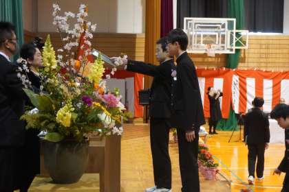 3月15日(火) はじめに、校長から卒業証書が生徒一人一人に授与されました。写真はA組男子です。