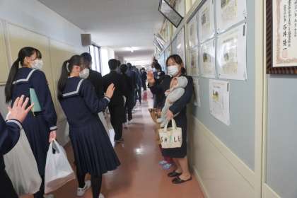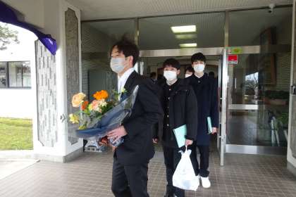 歓送 その4 公開日 2022/03/16 更新日 2022/03/16 学校行事 3月15日(火) 職員室前を通過すると正面玄関前に1年生のときに担任をしてもらった先生がいらっしゃいました。お子様を連れて、卒業生を見送ってくださいました。生徒もうれしそうでした。
