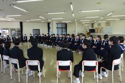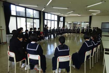 2年生はランチルームで学年集会を行いました。学年主任が、生徒にこれまでの中学校生活2年間を振り返って思いを伝えているところでした。生徒は真剣な表情で聞いていました。いよいよ最上級生になります。残りの1年間、目標をもって充実した学校生活にしてください。