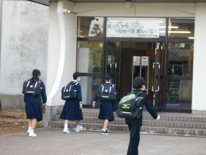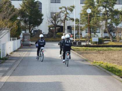 上:生徒玄関前です。 中:北側門からの登校です。 下:自転車通学生です。(一列ですばらしい)