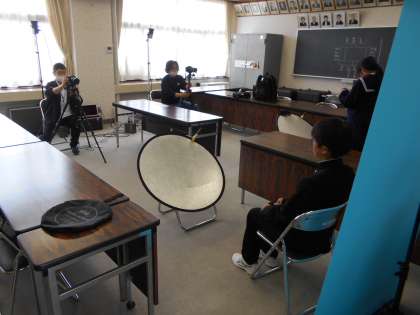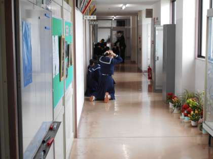 上:はい、チーズ。 下:廊下では、静かに順番を待っています。