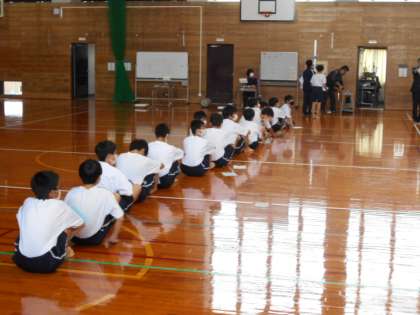 上:身長を測定しています。 中:内履きがきれいに揃っていますね。 下:聴力を測定しています。