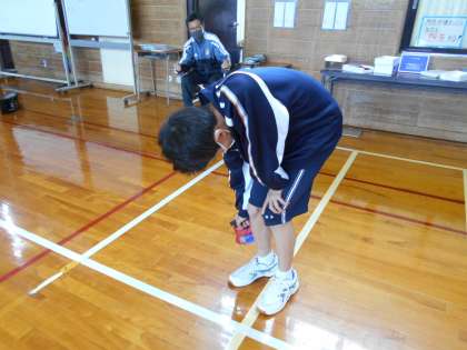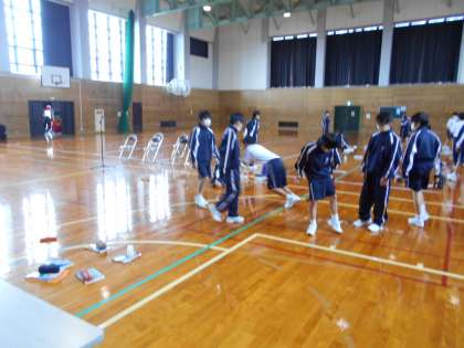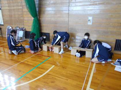 1−A:保健体育は、スポーツテストです。 仲良く、真剣に取り組んでいます。 上:長座体前屈 中:立ち幅跳び 下:握力