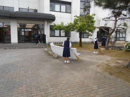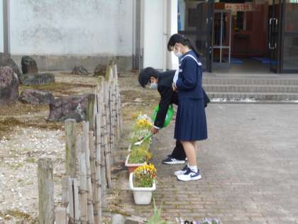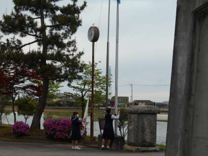 生徒会の活動です。 上:クリーン清掃(前庭清掃) 中:花の水やり 下:国旗・校旗の掲揚