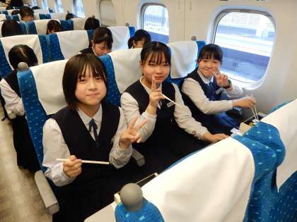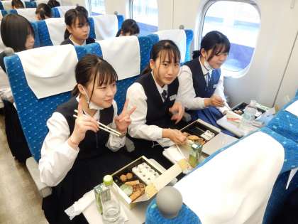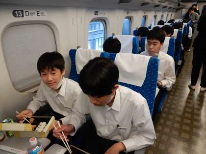 修学旅行最初の食事は、新幹線車内でお弁当をいただきました。感染症対策として、食事の前には手指消毒を行いました。写真から美味しそうに食べている様子が伝わってくると思いますが、黙食を徹底しています。