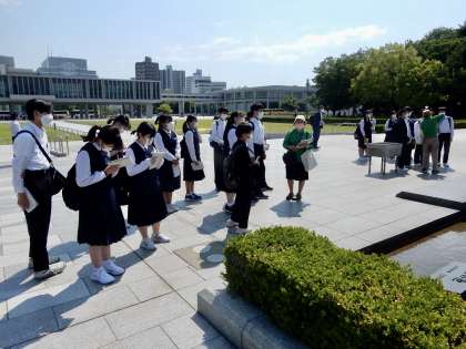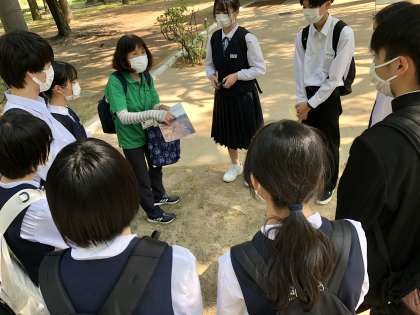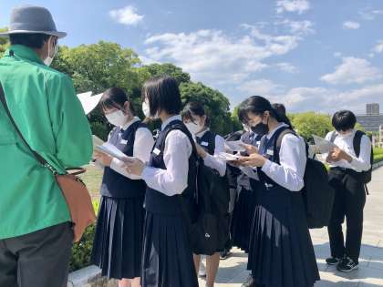 ボランティアガイドの方のお話を傾聴し、メモをとりながら平和について考え、学んでいます。