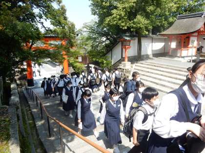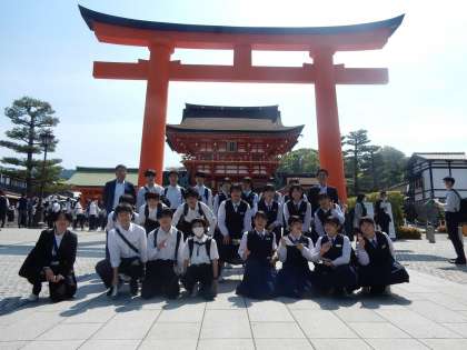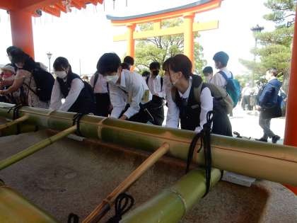 修学旅行 伏見稲荷大社(その1) 公開日 2022/05/18 更新日 2022/05/18 3年生 A組の最初の見学場所は伏見稲荷大社です。 鳥居の前で集合写真を撮り、境内に入りました。まずは手を清めて参拝の準備です。