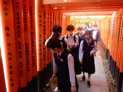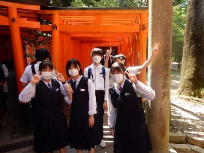 千本鳥居に入る前の班集合写真です。 (写真上)A組3班 (写真中)A組4班