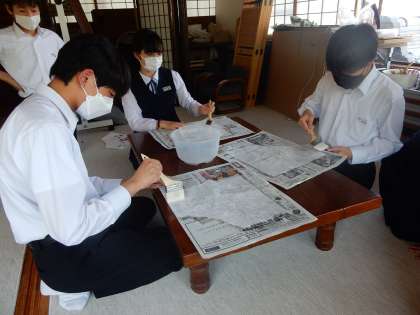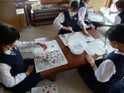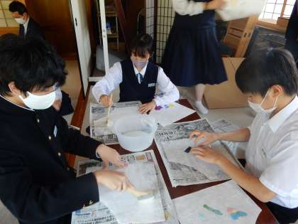 切ったりちぎったりした和紙をのりで貼り合わせました。