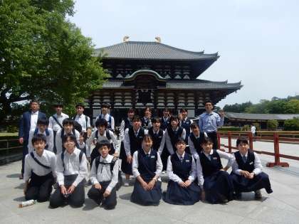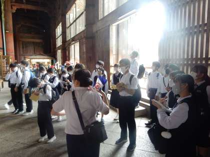 修学旅行 3A 東大寺(その1) 公開日 2022/05/19 更新日 2022/05/19 3年生 (写真上)大仏殿の前でクラス写真を撮りました。 (写真中)大仏殿の中に入ります。 (写真下)ガイドさんによる大仏の話を聞いています。 歴史の教科書で写真を見たことがありますが、本物の大仏の大きさに驚いていました。