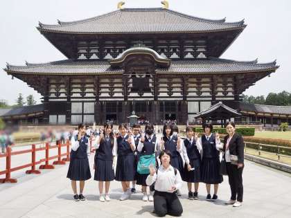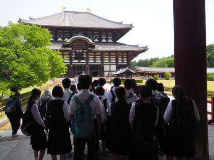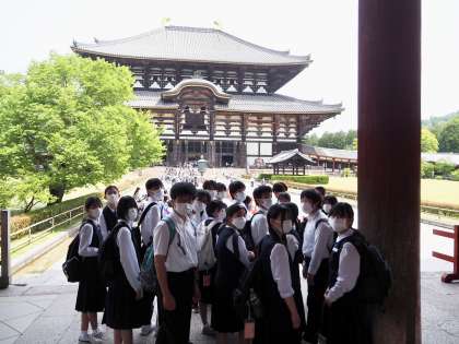 修学旅行 B組 東大寺 公開日 2022/05/19 更新日 2022/05/19 3年生 大仏殿では、「奈良の大仏」で知られる盧舎那大仏を目の前にしてきました。高さ約15m、顔の幅約3.2m、手の大きさ約2.5mの存在感に圧倒されました。